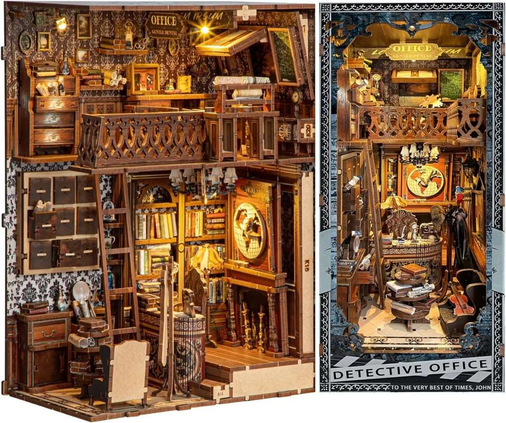Por si mi explicación no ha sido muy clara, que es lo más posible, esto es un Book Nook de una oficina de detective privado, que a mí me recuerda a la de Sherlock Holmes, perfecta para encajarla entre tus novelas policíacas.